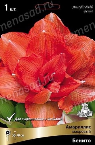 Амариллис махровый Бенито - изумительный нарядный сорт, станет центральной частью любой цветочной композиции, привнося радость и вдохновение своим присутствием. Растение высотой 50-70 см с ремневидными зелёными листьями и крупными махровыми цветками. На каждом цветоносе формируется от 2 до 4 цветков. Их великолепные двухслойные лепестки очаровывают ярким оранжевым цветом, который мягко меняется, создавая градиент и высветляя центральную часть лепестка. Каждый цветок достигает внушительных размеров — около 18 сантиметров в диаметре, превращаясь в истинное украшение любого интерьера. Сорт источает сладковатый аромат с цветочными нотками, способен поднять настроение, наполнив пространство энергией природы и удивительной красотой.