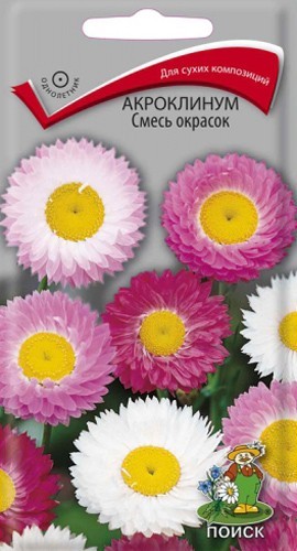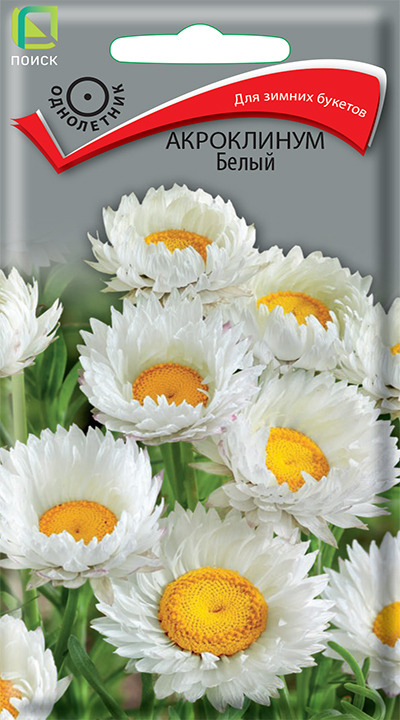 «Вечное» растение, идеальное для зимних букетов. Относится к группе сухоцветов. Красивые белые цветки похожи на маргаритки, сидят на тонких стеблях высотой до 50 см. Лепестки цветов по структуре напоминают сухие шуршащие чешуйки. Используют в зимних букетах. Для засушивания цветы срезают почти раскрывшимися.
