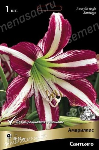 Амариллис простой Сантьяго – великолепное луковичное растение, которое украсит ваше жилье и сад сочными красками. Цветки колокольчатые, с узко вытянутыми лепестками. Окраска насыщенная красная с продольными белыми полосками в центре лепестков. На цветоносе обычно образуется по 3-5 цветков, диаметром 18-20 см. Высота растения 50-70 см. Использование: для горшечной культуры, на срезку. Прекрасные крупные бутоны с озорной окраской не оставят никого равнодушным и преобразит интерьер, наполнив его энергией и страстью.