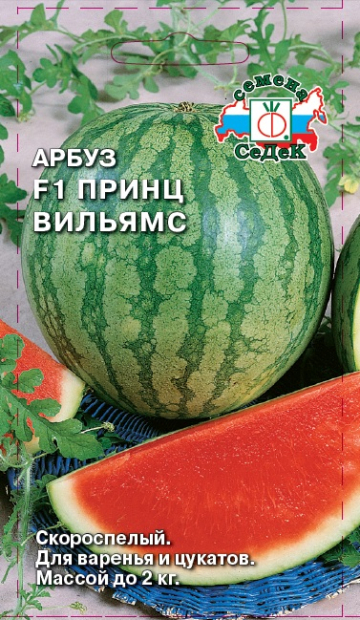 Арбузы серии «Принц» отличаются восхитительным вкусом и скороспелостью. Скороспелый (от всходов до созревания плодов 70-80 дней) гибрид для открытого и защищенного грунта. Подходит для выращивания в зонах неустойчивого земледелия даже в открытом грунте. Плоды округлые, светло-зеленые с тонкими темно-зелеными полосами, не крупные, массой 1,5-2 кг. Кора тонкая. Мякоть ярко-красная, зернистая, изумительного вкуса. Урожайность с растения 4-6 кг. Ценность гибрида: неприхотливость выращивания, быстрая отдача урожая, высокий процент сахаристости, порционность плодов. Рекомендуется для употребления в свежем виде и приготовления цукатов и арбузного меда.