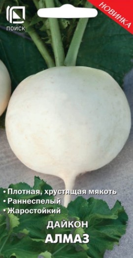 Сорт среднеспелый (60-70 дней), отличается высокими вкусовыми качествами. Образует корнеплод длиной 40-60 см и до 9 см в диаметре, с округлой головкой и белой кожурой, массой до 1,5 кг, который на 3/4 погружен в почву. Мякоть плотная, сочная и хрустящая, ярко-белого цвета. Сорт жаростойкий, устойчив к цветушности. Урожайность 10,6-12,6 кг/м . Дайкон полезен людям, страдающим заболеваниями сердца, почек, печени, подавляет вредную микрофлору кишечника. Используется в свежем, вареном, тушеном, соленом виде и для непродолжительного хранения.