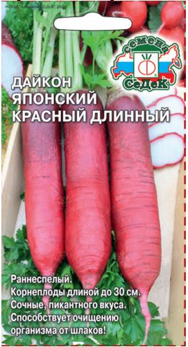 Раннеспелый сорт (от всходов до хозяйственной годности 50-55 дней) для открытого и защищенного грунта. Корнеплоды удлиненно-цилиндрические, малиново-красные, с небольшим розовым кончиком, длиной 25-30 см, массой 0,3-0,6 кг. Мякоть белая, плотная, сочная, пикантного вкуса. Урожайность 2,5-3,0кг/м2. Ценность сорта: устойчивость к заморозкам, растрескиванию, цветушности, стабильная урожайность. Отличный диетический продукт, способствует очищению печени, желчного пузыря. Широко используется для профилактики диабета и при облучении. Рекомендуется для употребления в свежем, вареном и соленом виде.