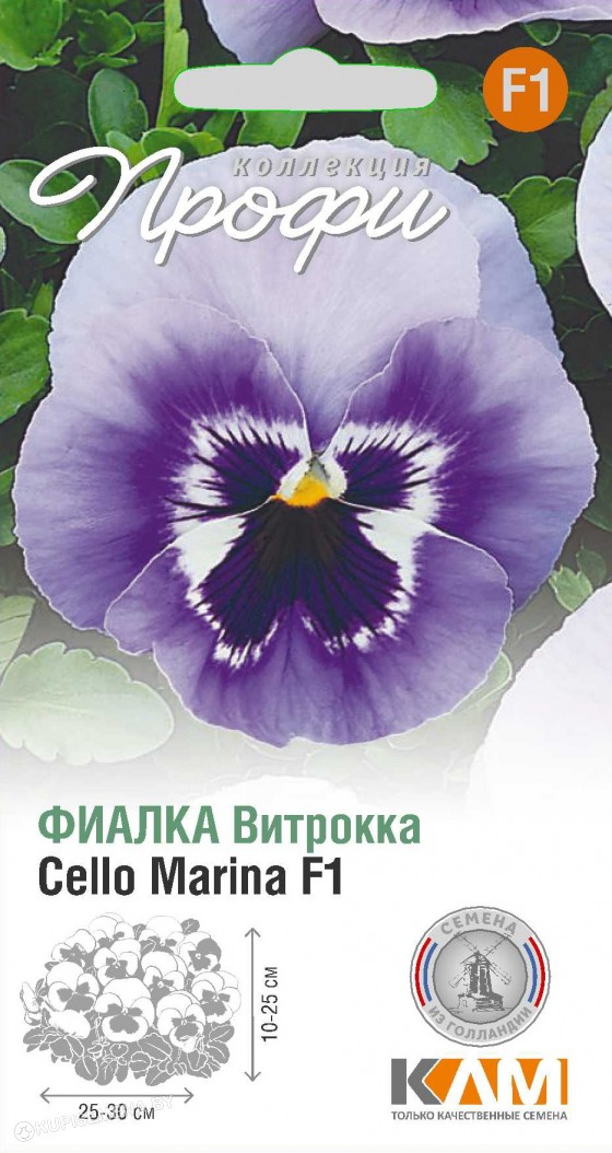 Целло Марина имеет прочную репутацию на рынке больших цветочных анютиных глазок. Анютины глазки Целло имеют нерастягивающуюся крепкую растительность с хорошим базальным ветвлением, а ее цветки прочно стоят вертикально на коротких, сильных цветоносах. Силлоу прекрасно подходят для осенне-весеннего производства в горшках, пакетах и отлично растут на грядках и в ландшафтном дизайне. Большой размер цветка. Окраска цветка фиолетово голубая.