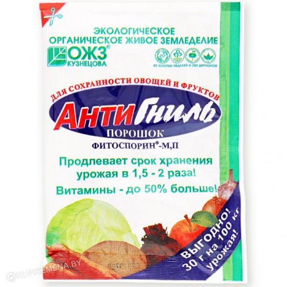 АнтиГниль – природный биофунгицид на основе бактерий для защиты овощей, ягод и фруктов от гнилей при хранении и транспортировке. Продлевает срок хранения продуктов в 1,5–2 раза.