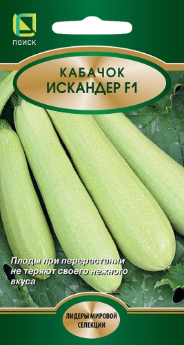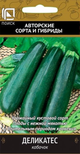 Плоды при перерастании не теряют своего нежного вкуса. Ранний высокоурожайный гибрид. Растение кустовое, компактное. Лист светло-зеленый до темно-зеленого, среднерассеченный, с пятнистостью. Плод цилиндрический с сужением к плодоножке, средней длины, светло-зеленый с белой пятнистостью. Масса 0,7 кг. Мякоть плотная, нежная. Вкус хороший. Рекомендуется для столовых целей и консервирования.Семена обработаны тирамом, не требуют замачивания.