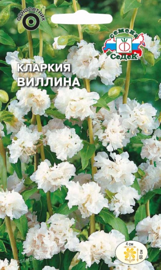 Однолетнее растение. Куст густоветвистый, объемный диаметром до 35 см. Стебли тонкие, крепкие, 60 см высотой. Листья овальные, сизо-зеленые с красными жилками. Цветки махровые, белоснежные, до 3-4 см в диаметре, расположены по одному в пазухах листьев. Размножают семенами, которые высевают в апреле в открытый грунт или полутеплый парник. Всходы появляются через 10-14 дней. На постоянное место высаживают в конце мая, закаленные растения легких заморозков не боятся. Посадку в грунт осуществляют обязательно с большим влажным комом земли, выдерживая расстояние между растениям 20-25 см. Для получения компактных, обильно цветущих кустиков верхушки растений прищипывают на высоте 12 см, после чего они хорошо ветвятся и обильно цветут. Используют для групповых посадок, клумб, рабаток и срезки. Особенно хороша кларкия в букетах. В срезке у кларкии распускаются все бутоны.