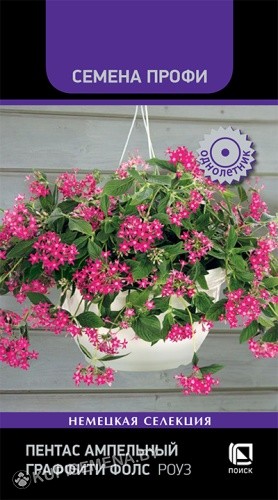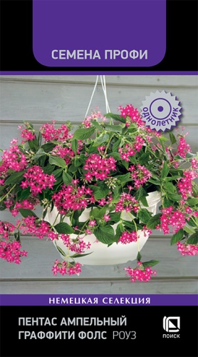 Уникальная новинка! Первый ампельный пентас из семян! Растение высотой 15-20 см великолепно ветвится от основания, побеги свисающие, длиной 30-40 см. Листья насыщенно-зелёные с ярко выраженным жилкованием. На конце каждого побега расположены зонтиковидные соцветия, состоящие и из множества звёздчатых цветков. Окраска насыщенно-розовая. Цветение обильное и продолжительное. Привлекает бабочек и пчёл. Используется для подвесных кашпо, контейнеров и балконных ящиков.