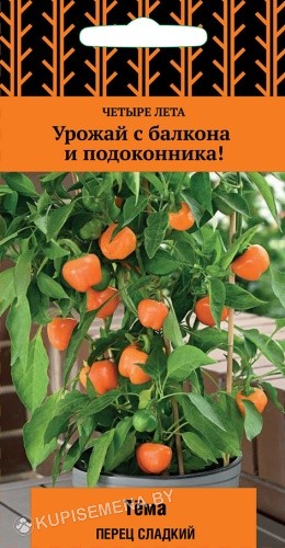 Раннеспелый сорт. Период от высадки рассады до созревания 55 дней. Растение компактное, высотой 45-60 см и диаметром 30-50 см, обильно плодоносит в течение сезона. Плоды имеют форму усеченной призмы, размером 6х5 см. Сладкие, ароматные - идеально подходят для фарширования. Рекомендуется для выращивания в горшках и контейнерах на балконе и подоконнике.