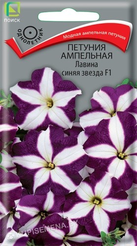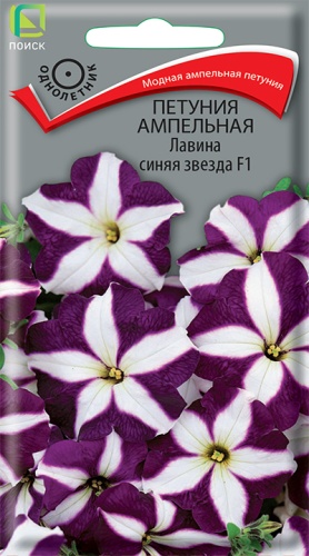 Новая модная группа ампельных петуний! Молодые растения прямостоячие; вырастая, побеги свешиваются и образуют лавину из цветов. Эффектные сине-фиолетовые воронковидные цветы с контрастной белой звездой в центре. Цветёт обильно с июня по октябрь. Великолепно подходит для подвесных корзин, балконных ящиков..
