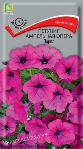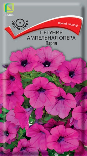 Привлекательная ампельная петуния с крупными цветами. Молодые растения прямостоячие, вырастая, свешиваются и образуют лавину из цветов (побеги достигают длины 70-80 см). Цветы эффектные, диаметром 8 см, пурпурной окраски. Цветет обильно с июня по октябрь. Великолепно подходит для подвесных корзин, балконных ящиков.