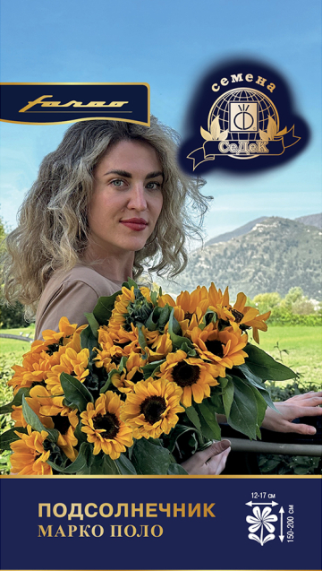Подсолнечник однолетний декоративный раннецветущий гибрид итальянской селекции. Марко Поло обладает высокой декоративностью и продолжительной сохранностью в срезке. Гибрид будет высоко оценен как во флористике, так и в ландшафтном декорировании. В зависимости от региона выращивания, первые яркие изящные соцветия-корзинки, диаметром 12-17 см, раскрываются через 55-65 дней от посева. Лепестки оранжевые, овальной формы, очень эффектно смотрятся на фоне темного диска. Стебли прочные, высотой 150-200 см, не ветвятся, листья небольшие. Растения не имеют пыльцы и не вызывают аллергических реакций. Этот гибрид идеален для срезки, букет из него будет радовать вас почти три недели. Растения неприхотливы в уходе. Посевы размещают на плодородных, дренированных почвах нейтральной кислотности. Перед этим необходимо провести обеззараживание почвы. Посев на рассаду производится в апреле, в отдельные горшочки, и ускоряет цветение на 3-4 недели. Прямой посев в грунт осуществляют в мае, когда минуют заморозки.
