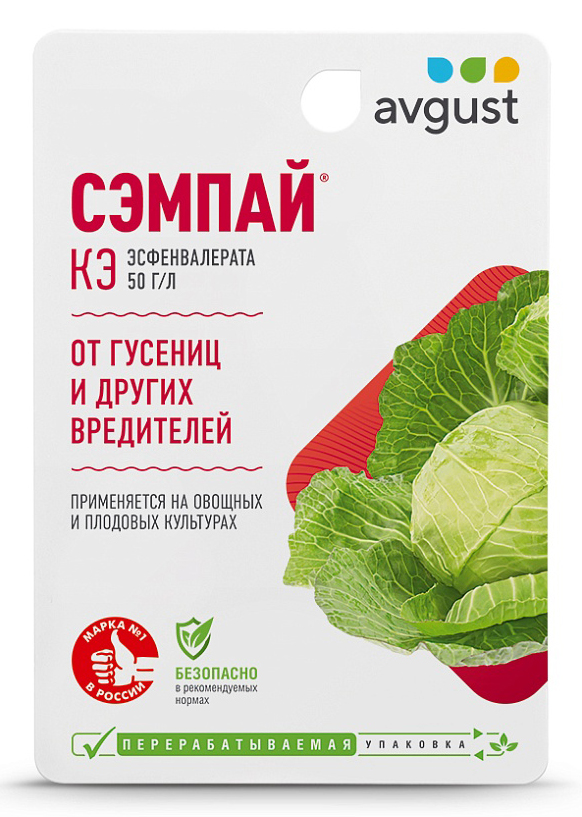 Благодаря улучшенной препаративной форме, содержащей прилипатель, Сэмпай надежно удерживается на листьях обработанных растений, при этом период его защитного действия составляет не менее 2-х недель. Кроме яблонь Сэмпай пригодится на капусте в борьбе с гусеницами белянок, совок и моли.
