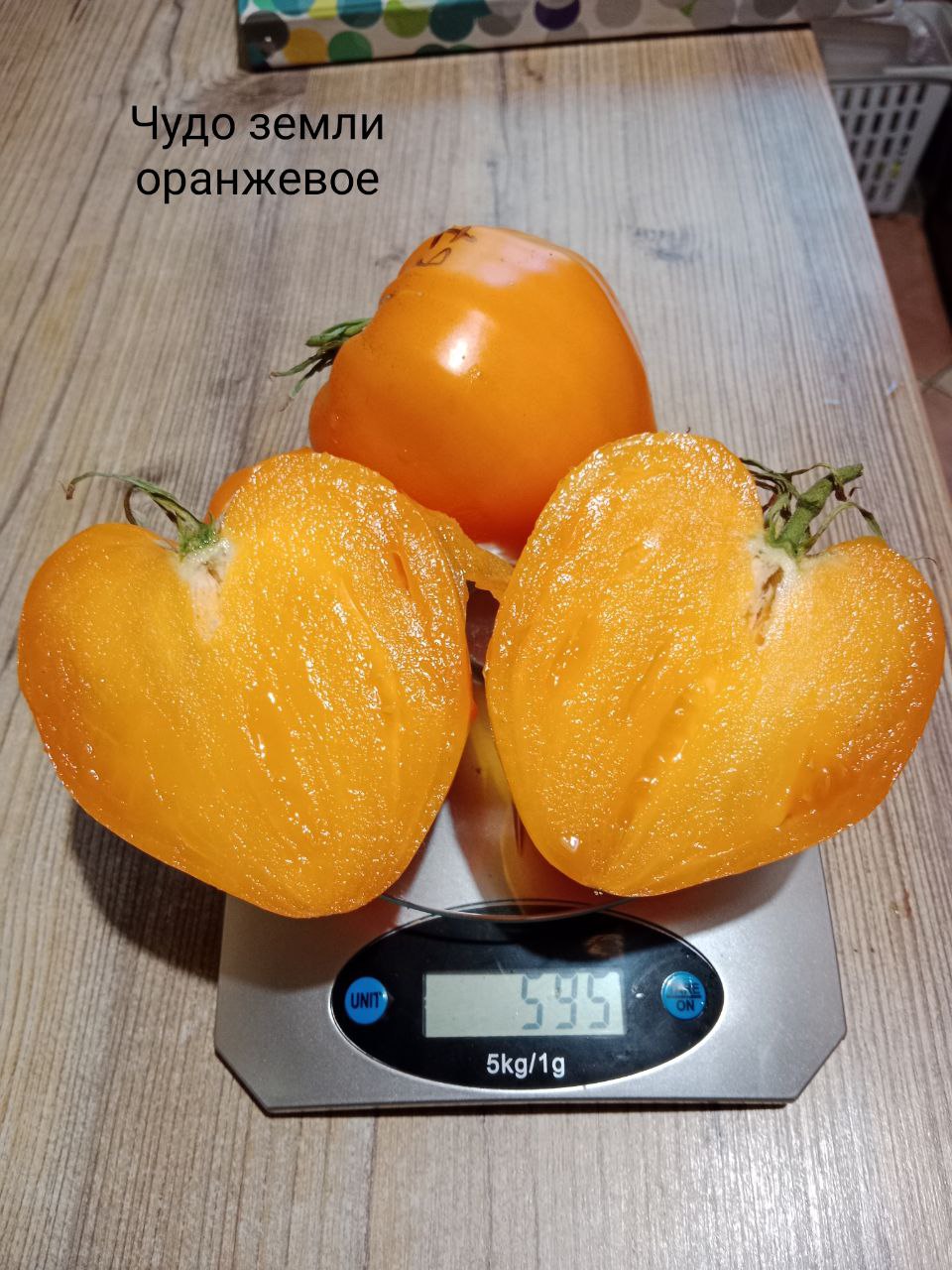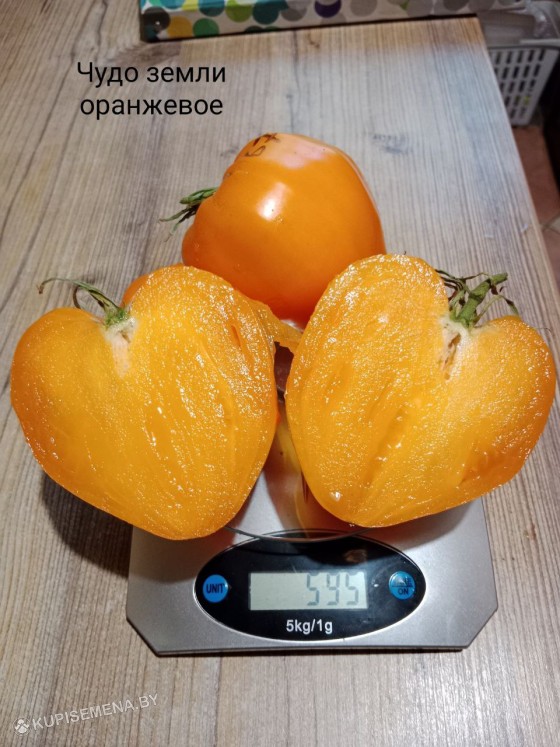 Томат Чудо земли оранжевое. Индетерминантный, высокорослый (1,8-2 м), среднеспелый сорт. Плоды яркие, желто-оранжевые сердца, мясистые, малосемянные, вкусные, сладкие. Семян в плодах практически нет, сплошная маслянистая мякоть. Плодоношение растянуто на весь сезон и плоды зреют до самых заморозков. Крупные. Размер плодов практически одинаковый по всей высоте куста. Урожайность высокая. Хорошо лежат и дозариваются.