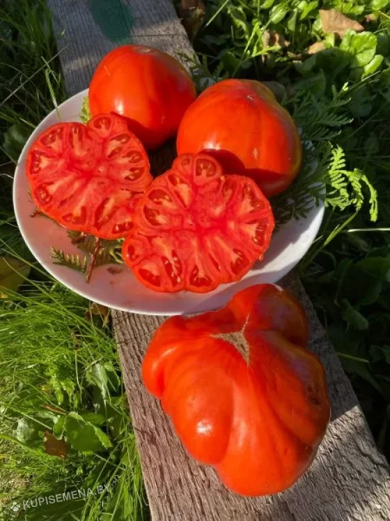 Среднеспелый, индетерминантный сорт. Плоды уруаные красные. В кисти по 4 крупных плода от 400 г до 1 кг. Мякоть плода плотная, сочная, сладкого вкуса. Семенные камеры почти отсутствуют. Семян мало.