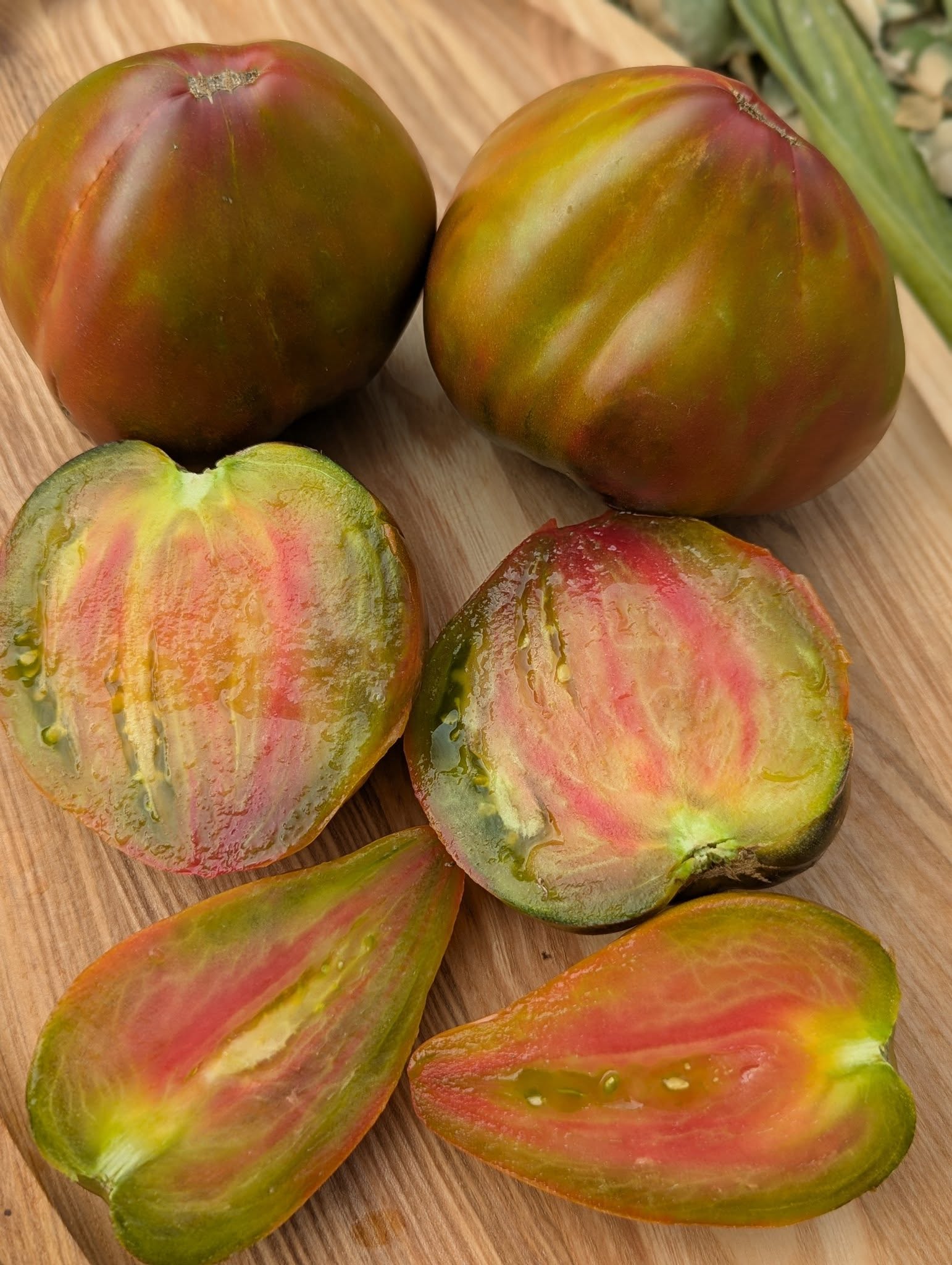 Сочные сердцевидные томаты, бывают вытянутые с изящным носиком, словно созданы для того, чтобы пленять взгляд. Их многоцветная палитра — изумрудно-розово-пурпурно-жёлтая с таинственной антоциановой шапочкой — создаёт впечатление, что плоды светятся изнутри, переливаясь всеми красками летнего заката.
