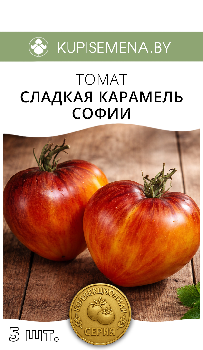 Селекция Софии Сааковой. Индетерминантный, среднеранний. Куст высокий 2 м, может достигать 2.5 м. Плоды в форме вытянутого сердца с носиком весом 150-300 г красиво окрашенные, желто-оранжевые с красными полосами-штрихами и хорошей антоциановой окраской. Мякоть биколорная, вкусная, необычайно сладкая.Семян в плодах мало. Великолепный сорт для гурманов, который понравится всем.