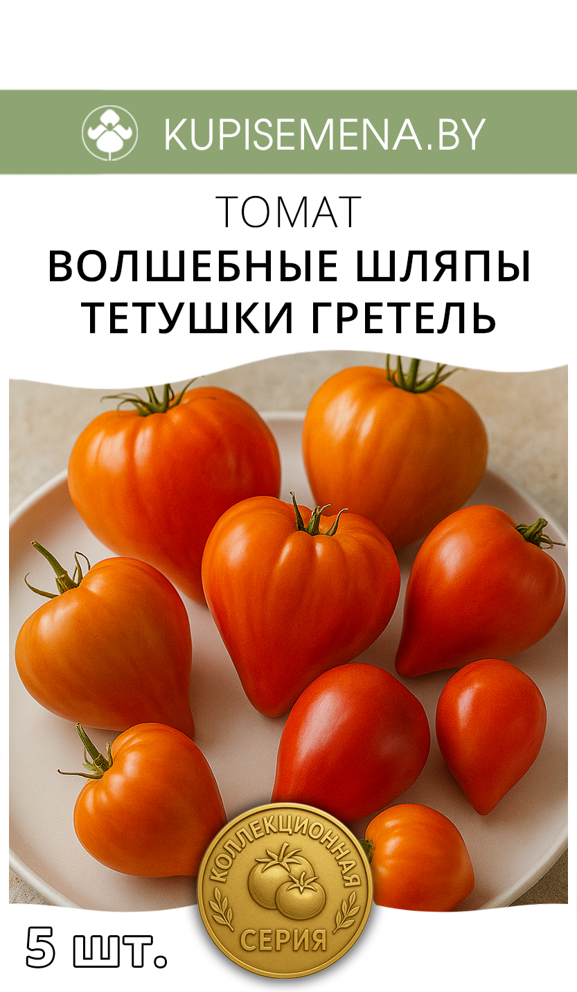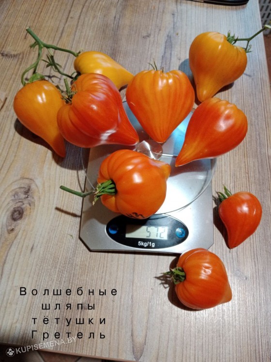 Томат Волшебные шляпки тетушки Гретель /Tante Gretels magische Hüte/. Фамильная реликвия из Германии, г. Штутгарт. Индетерминантный, высокорослый, (1.8-2 м), среднеспелый. Плоды сердцевидные, биколорного окраса, с красивым носиком, массой от 120 до 200 граммов, очень вкусные, мясистые, сладкие. Один из сортов, который поражает красотой плодов и великолепным вкусом. Очень красивый, урожайный сорт.