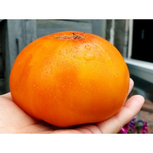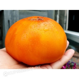 Высокорослый, среднеспелый сорт. Очень необычный сорт. Тяжелые, плотные плоды жёлто -оранжевые, с красными разводами, округло-плоские, крупные, 300-500г. Очень мясистые, сочные, превосходного сладкого вкуса с приятным ароматом.