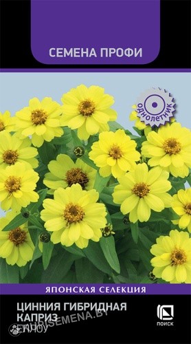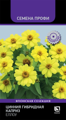 Обилие цветов! "Каприз" - межвидовая серия циннии. Растения компактные сильноветвящиеся высотой 20-25 см. Цветы махровые и полумахровые диаметром 4-6 см. Окраска - жёлтая. Отличается обильным и продолжительным цветением. Великолепно подходит для контейнерного озеленения и высадки в цветники и бордюры.